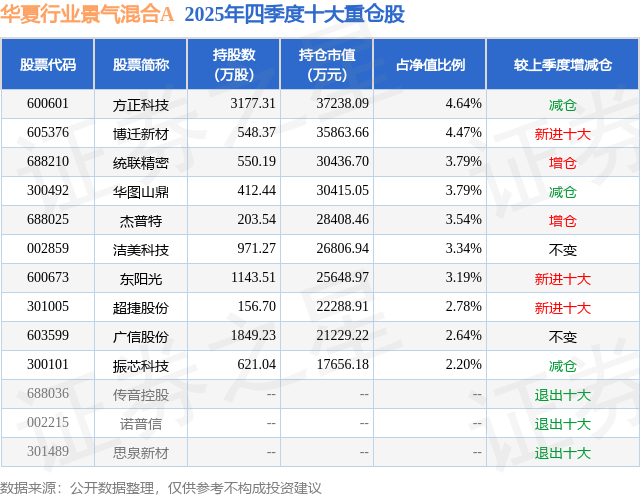 为证券之星据息拾掇,办理时间为2025年8月12日至今,此中持无数量最多的公募基金为华夏基金的华夏行业景气夹杂A。